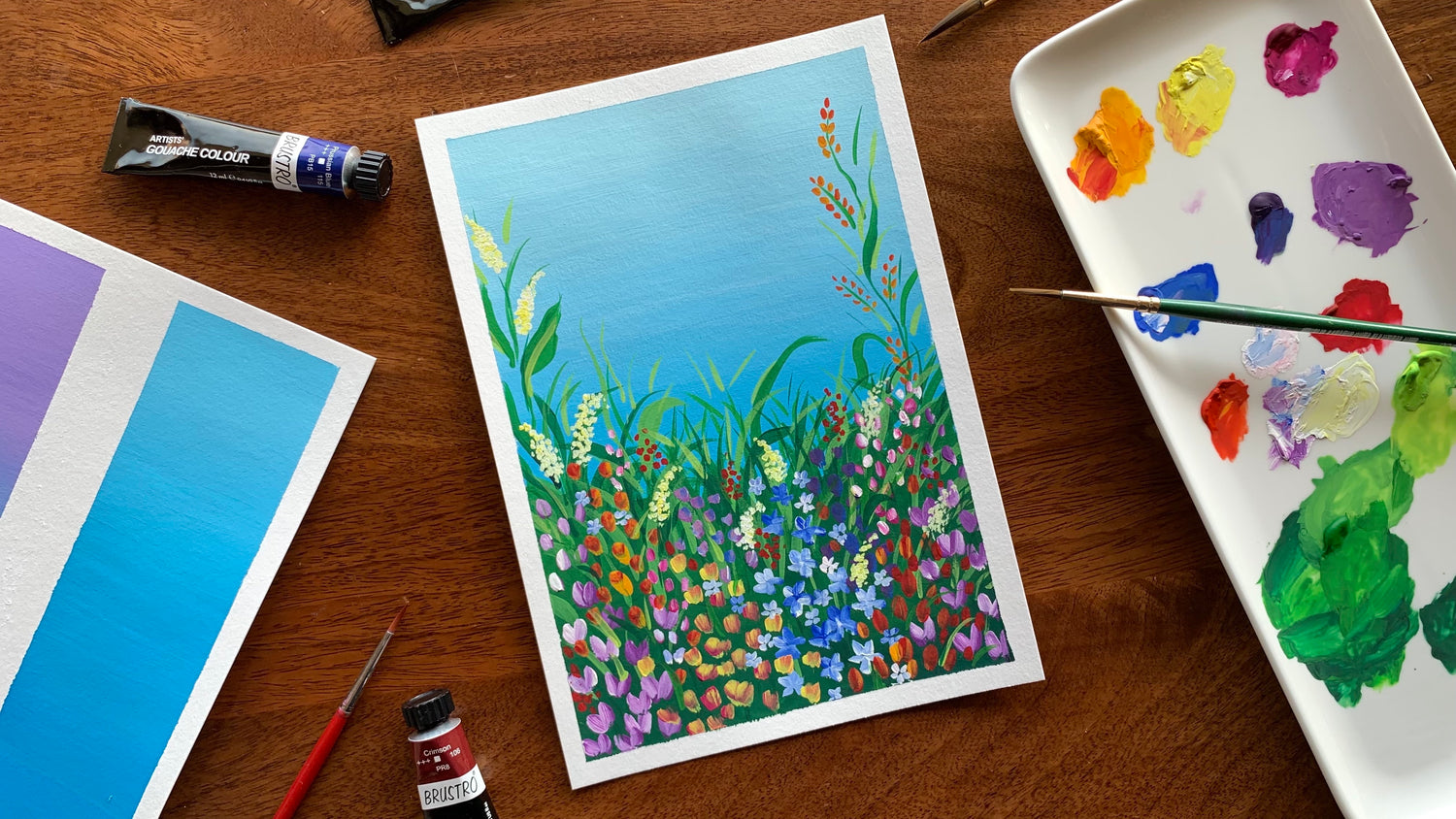 In this class you will learn to paint a wildflower garden scene filled with vibrant multicoloured flowers. It is also an introductory class to gouache and we will be exploring and trying to understand the paint medium.