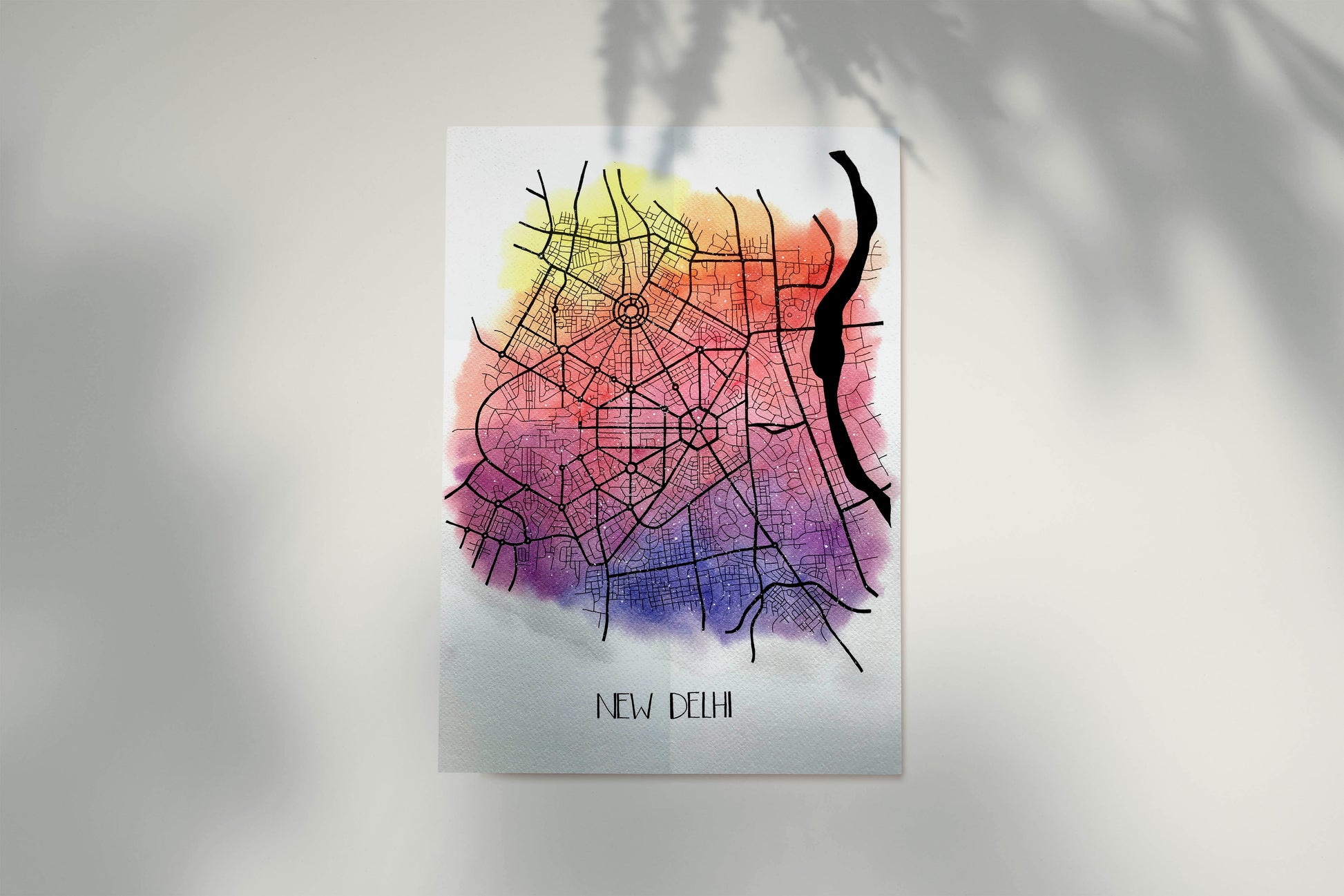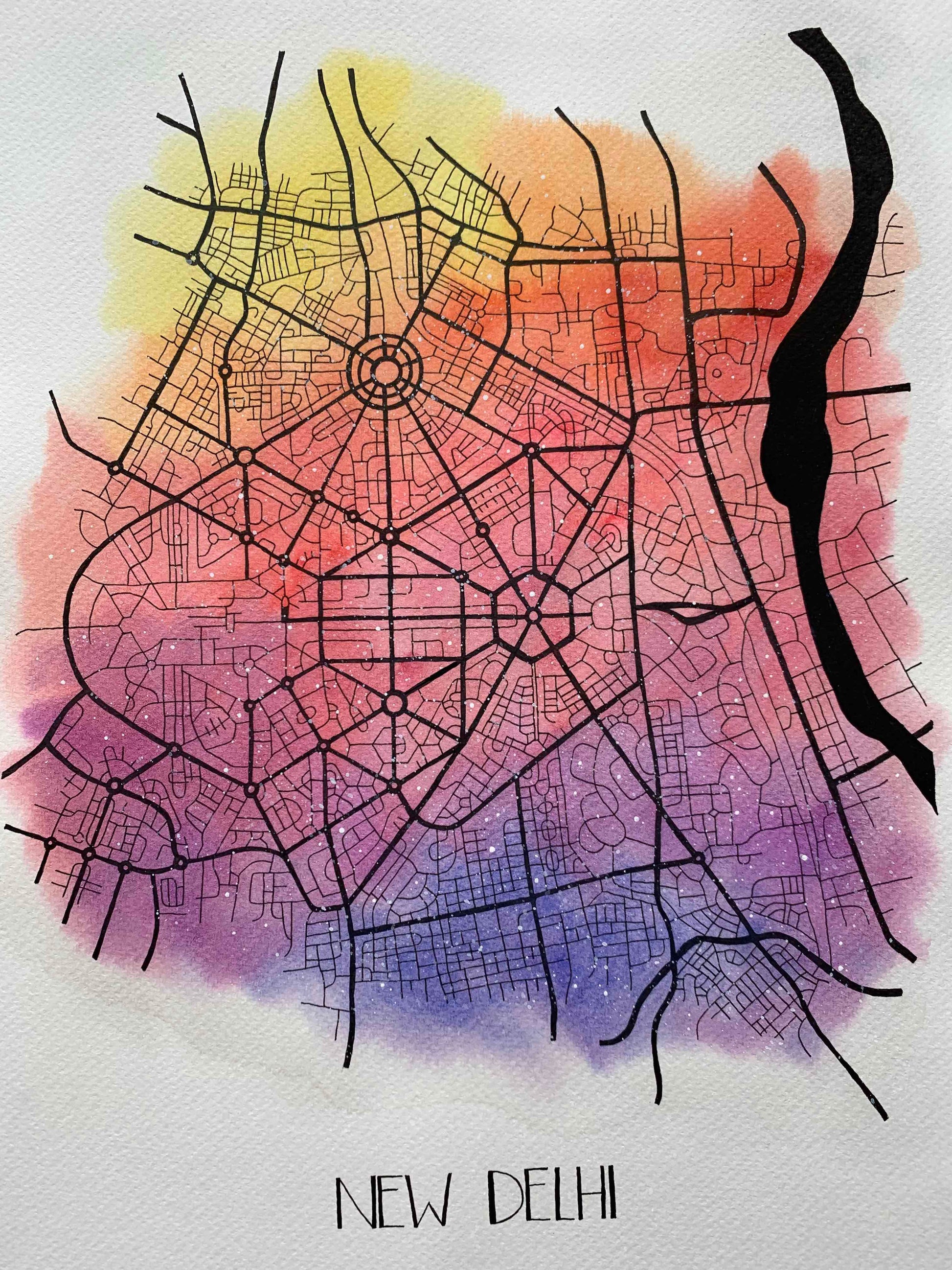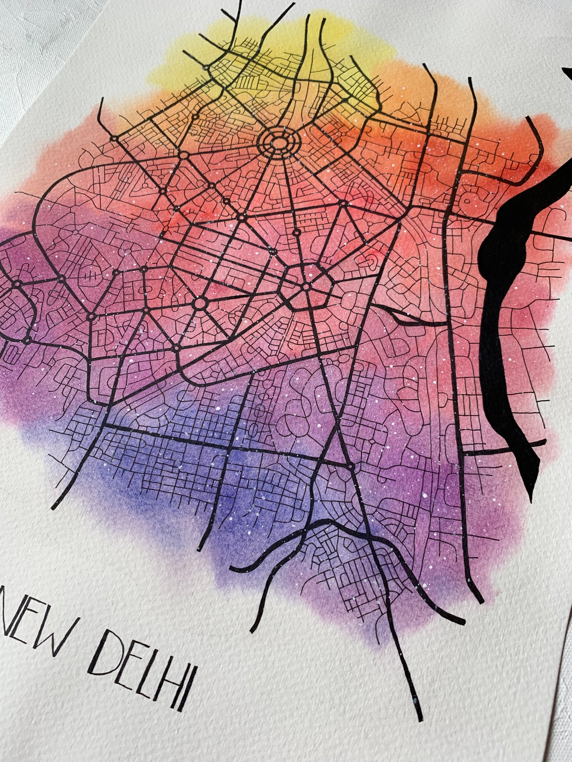 Illustration of map of New Delhi using watercolours and ink on 300gsm cold-pressed watercolour paper.